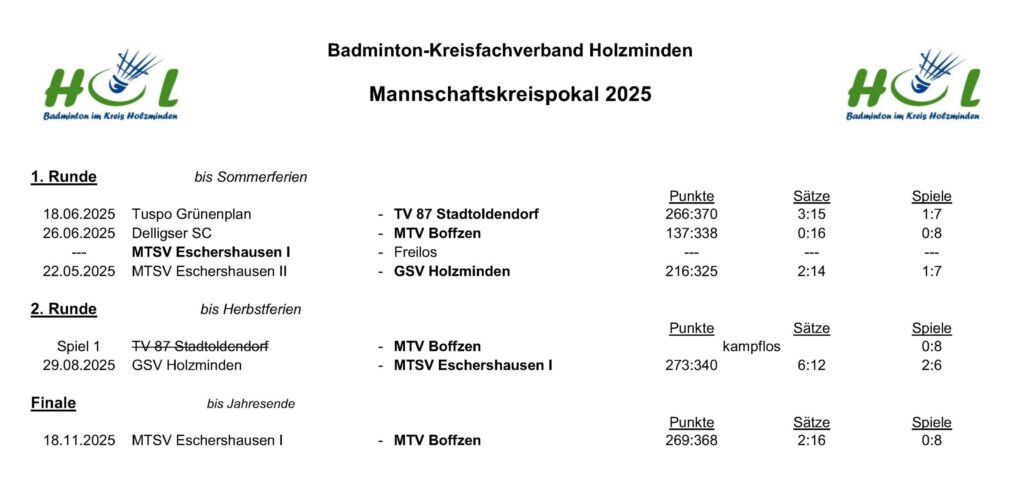 Das Finale wurde am 18.11.2025 zwischen dem MTV Boffzen und dem MTSV Eschershausen ausgetragen. Als klassentiefere Mannschaft hatte Eschershausen Heimrecht. Das 8:0 des Bezirksligisten von der Weser gegen die Raabestädter täuscht über eine spannende Begegnung hinweg. So waren Alexander Mevers und Tom Giesemann beim 17:21, 18:21 von der Überraschung gegen Jörg Söhngen und Sebastian Sander nicht weit entfernt. Die Eschershäuser führten über lange Zeit im zweiten Satz. Mit seiner Erfahrung konnte Söhngen entscheidende Bälle platzieren und den dritten Satz vermeiden. Auch im dritten Herren Einzel hatte der Boffzener Michael Hille leichte Probleme, kämpfte sich nach Rückstand im zweiten Satz aber zurück und gewann mit 21:19. Im letzten Spiel des Tages ging es hoch her. Escherhausens Sascha Rehbein spielte im Einzel gegen Sebastian Sander einen überragenden ersten Satz und gewann mit 21:12. Sander konnte im zweiten Satz mit starken Ballwechseln kontern und gewann mit 21:17. Angefeuert von den Mannschaftskameraden beider Seiten ergab sich ein spannender Entscheidungssatz, der bis zum 13:13 ausgeglichen verlief. Sebastian Sander blieb am Ende mit 21:16 der verdiente Sieger.